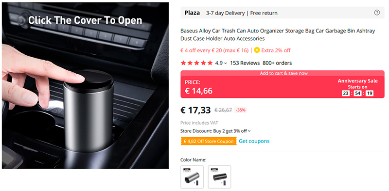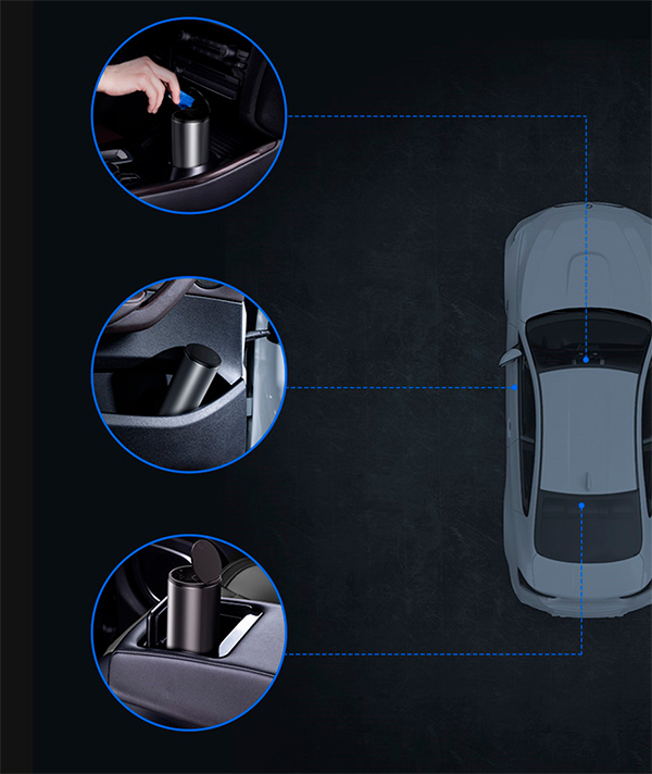 Алюминиевый мусорный контейнер для автомобиля на 500 мл с закрывающейся крышкой и сменным пакетом для мусора. Для остатков от еды, использованных салфеток и так далее. Крышка не пропускает запахи. Пакет с мусором легко меняется на новый. Помещается в держатель для стакана, боковой карман, в сетку сидения и так далее.
