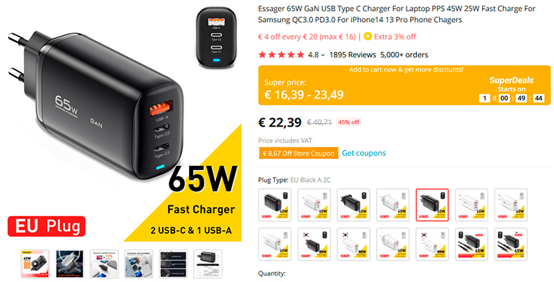 От этого же производителя недорогой трехпортовый универсальный GaN адаптер на 65 ватт. Один порт Type-C может выдавать 65 ватт, два порта одновременно выдают 45 и 20 ватт и могут питать/заряжать два соответствующих ноутбука. Также одновременно адаптер может заряжать, например, смартфон, планшет и игровую приставку.