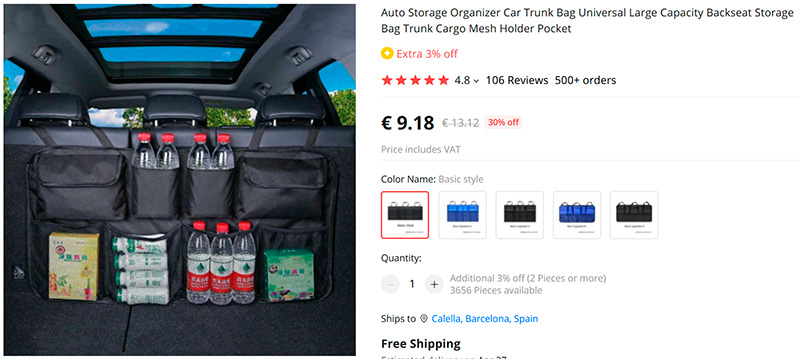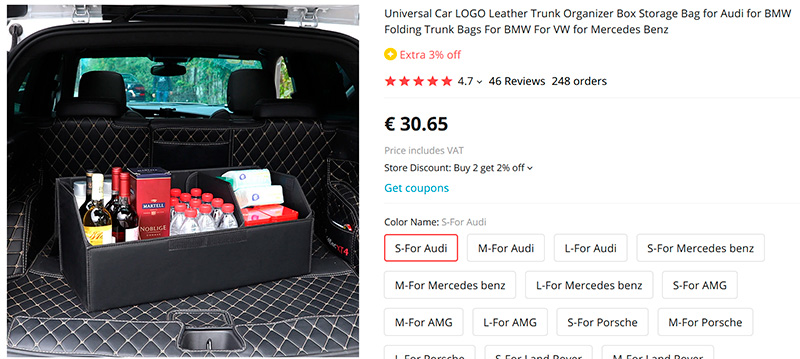Три вида (и два цвета) универсальных органайзеров для багажника машины-универсала, которые крепятся на подголовники задних сидений.