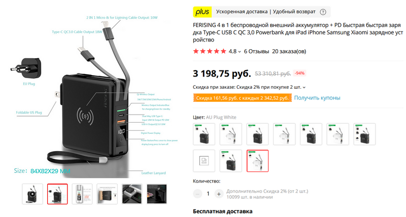 Любопытный внешний аккумулятор на 10 000 мАч "4 в 1". Поддержка QC 3.0, QC 4.0 и Power Delivery, беспроводная зарядка, порты USB и Type-C, дисплей с уровнем заряда и два встроенных кабеля microUSB и Type-C.