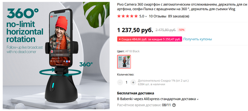 Любопытная штука - устройство для видеоблогеров: умный держатель для смартфона в вертикальной или горизонтальной плоскости, с отслеживанием лица и с нелимитированным вращением на 360 градусов. Имеет также крепление для штатива. Что называется - обойтись без операторов. Заказал себе, потестирую.