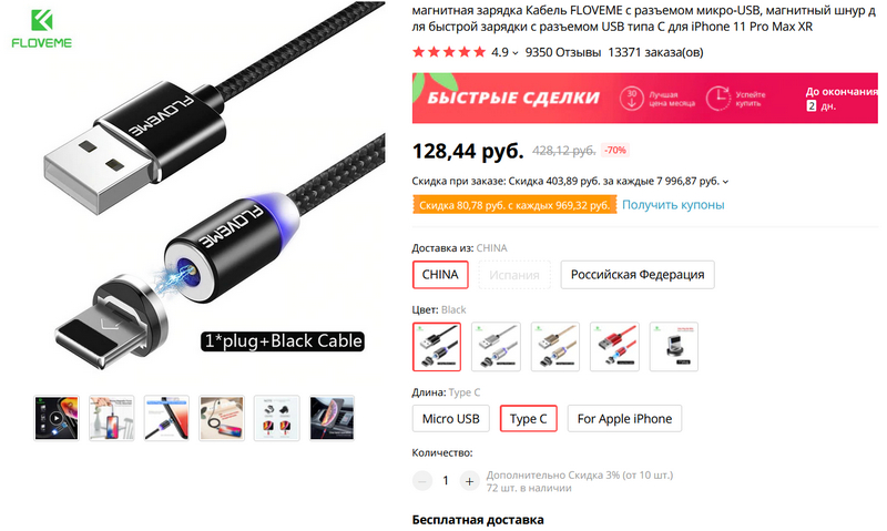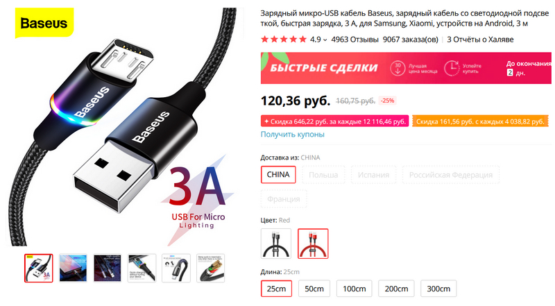 Качественный кабель microUSB от Baseus с подсветкой головки. Поддерживает быструю зарядку, есть два цвета и пять размеров: от 25 сантиметров до 3 метров. Вы спросите, кто сейчас вообще покупает кабели microUSB? Ответ - я покупаю. У меня переходников под Type-C - полно, а так получается универсальный вариант: и под microUSB, и под Type-C.