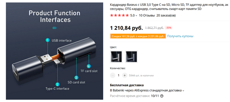 Удобный и очень компактный кардридер от Baseus (размером с помаду для губ), работающий с SD-картами и microSD, подключающийся по USB-A и USB-C. Для ПК, ноутбуков и разъездов.