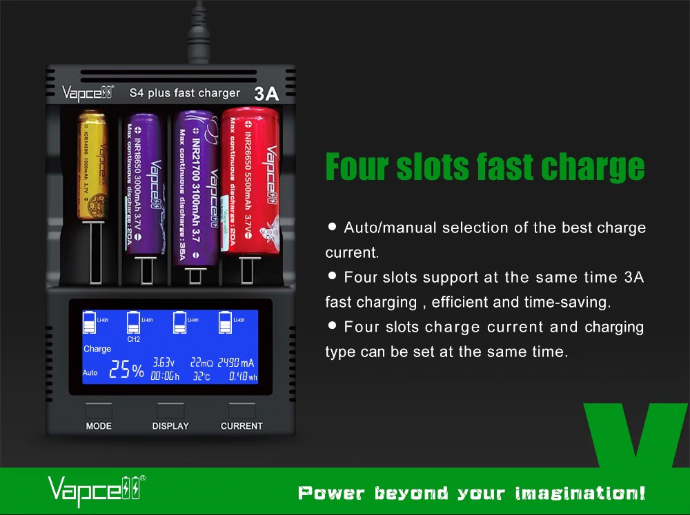 Вот такое четырехканальное зарядное устройство Vapcell S4 plus с током заряда до 3А на слот, с информативным дисплеем, а также возможностью использования в качестве повербанка.