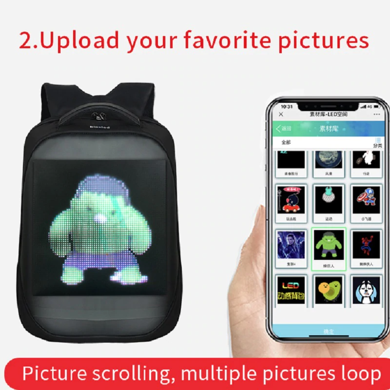 Очень прикольный рюкзак с LED панелью. Через телефон можно выводить текст/картинки.