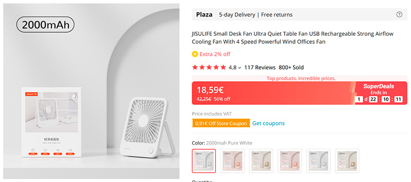 Как раз для лета - портативный складной вентилятор: четыре скорости работы, может стоять на столе на собственной подставке, может подвешиваться. Три цвета, два варианта встроенного аккумулятора: на 2000 или на 4500 мАч. Более емкая версия может автономно работать до 15 часов.