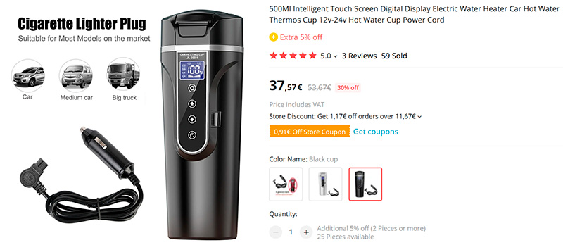 Автомобильный термос с дисплеем, показывающим температуру. Есть встроенное ситечко, с помощью которого можно заваривать чай прям в термосе. Объем - 450 мл. Может подключаться к прикуривателю, поддерживать нужную температуру и даже кипятить воду (потребуется 25 минут).