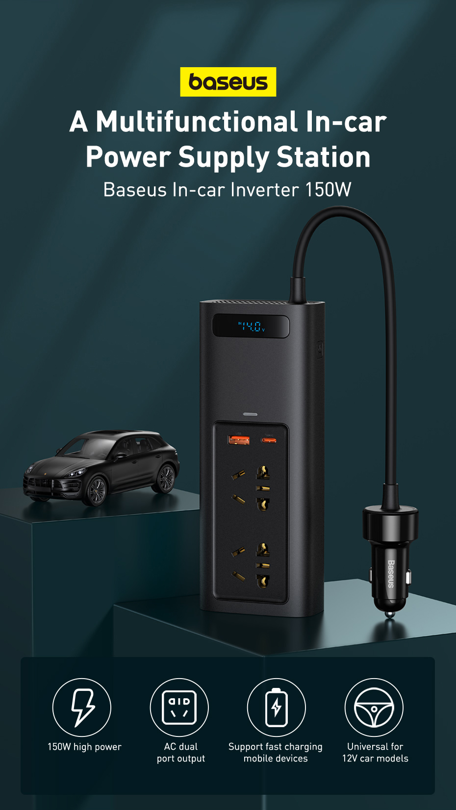 Для тех, кто не может без обычной розетки даже в автомобиле: автомобильный инвертор 12 -> 220 Вольт от Baseus мощностью 150 Ватт за ~ 3500 рублей (не забываем брать купоны). Электрочайник, конечно, не потянет, но ноутбук зарядить получится.
