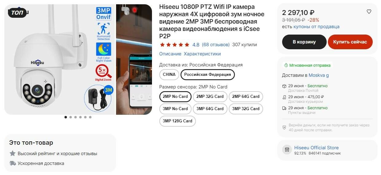 Камера наружного видеонаблюдения Hiseeu 2MP за 2107₽ с купоном продавца на 190₽ от 191₽ на AliExpress.