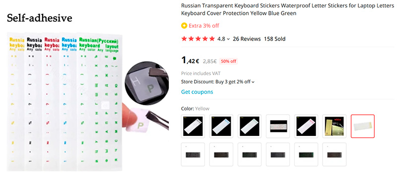Всегда полезная штука - прозрачные наклейки на клавиши ноутбука с русской раскладкой. Разных цветов.