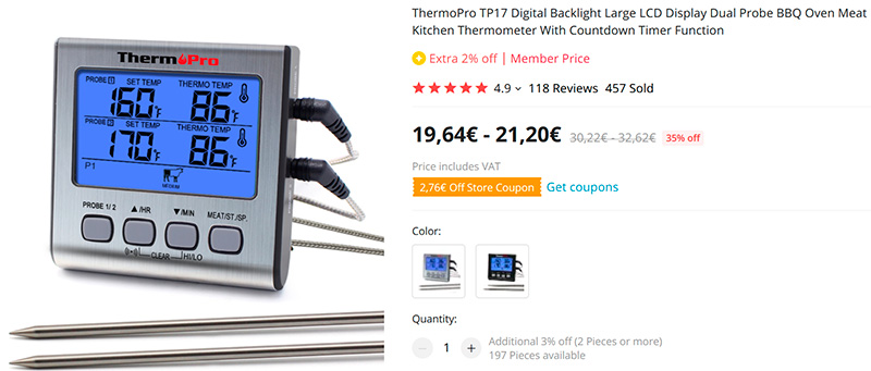 Я тоже пользуюсь InkBird. IRF-2SA, на два щупа (у этого продавца. но продавец австралийский, так что тут он вряд-ли интересен). Жалею, что в своё время не купил на 4 у них же похожий. Мне для копчения он был бы удобнее.