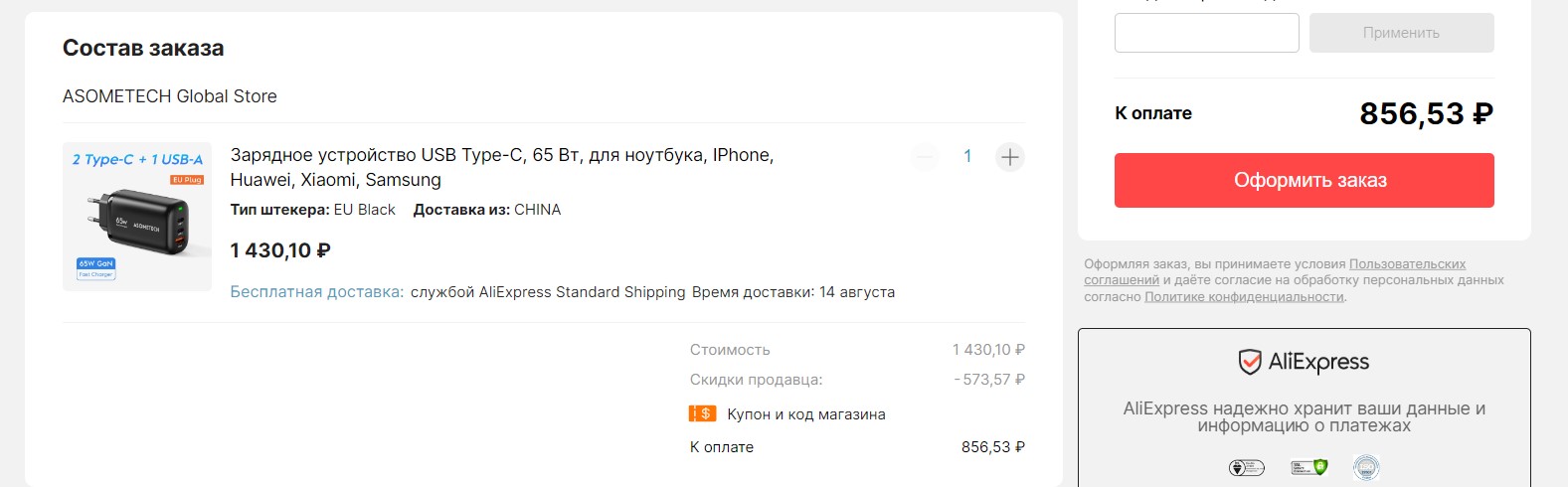Хорошая скидка на зарядное устройство 65W.Применяем промокод - 65WRU6Итоговая цена - 876,90 ₽