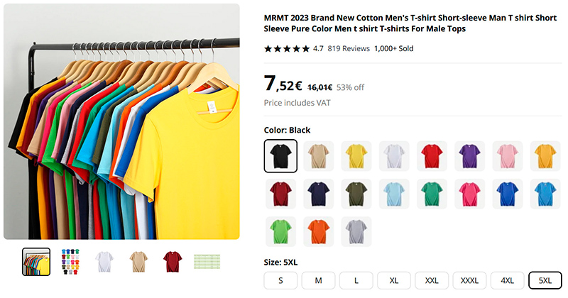 Недорогие однотонные хлопчатобумажные футболки свободного покроя аж 19 цветов. Размеры, судя по всему, соответствуют европейским, но все-таки сверьтесь на всякий случай с таблицей.