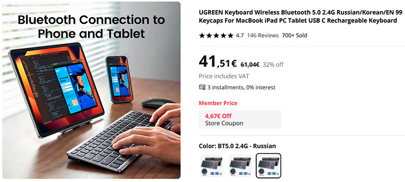 Полноформатная универсальная Win/Mac клавиатура Ugreen с подключением по Bluetooth 5.0 (и по радиоканалу) с практически бесшумным кликом. Для планшетов и смартфонов, iPad и iPhone. Заряжается через Type-C, есть версия с нанесенной заводским образом кириллицей.