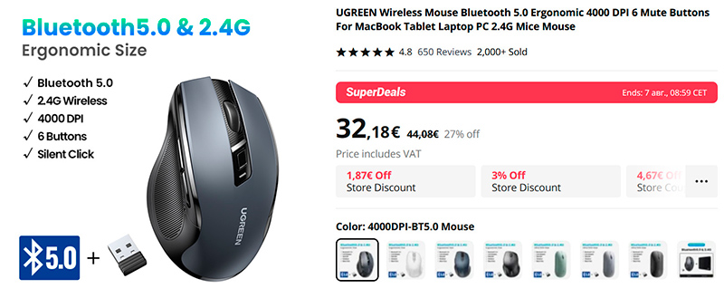 Эргономичная и недорогая мышка от Ugreen с подключением по Bluetooth (для ноутбуков особенно актуально, чтобы порт не занимать) и по радиоканалу (адаптер в комплект входит). Тихие клавиши, настраиваемые кнопки, 4000 DPI. Есть автоматический режим сна, продлевающий работу от одной батарейки до 18 месяцев.