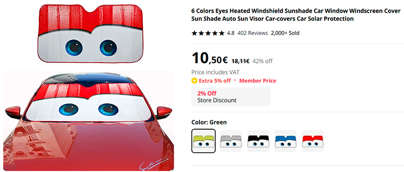 Люблю такое: шторка от солнца для машины (давно убедился в том, что использование подобной шторки в солнечную погоду - практически обязательно), превращающая ваш автомобиль в персонажа мультфильма "Тачки". Есть выбор из разных цветов.