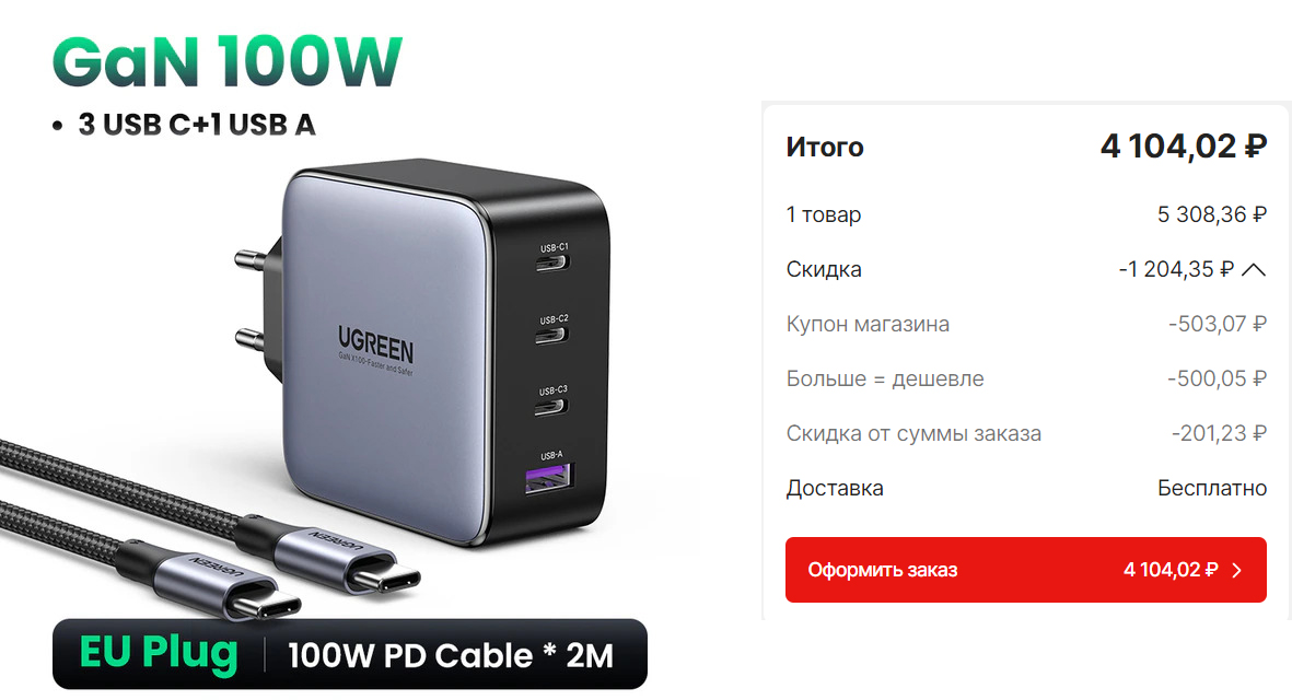 на тридцатку дороже (мне "югрин" показывает за 103), вдвое мощнее, 6 портов. Ко мне приехал за день. Крайне удобная штука на замену старому четырёхпортовому "Анкеру": долго колебался между 4 и 6, взял 6, все порты уже заняты 😄