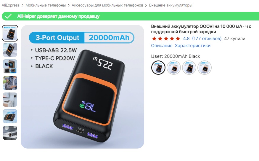 Цена с промокодом. Промокод: 1RB7NXMBUSBR. Повербанк имеет цифровой дисплей, 2 USB и Type-C выходы, мощность 22.5 Вт, поддерживает быструю зарядку QC и PD. Output(USB A1 & USB A2)