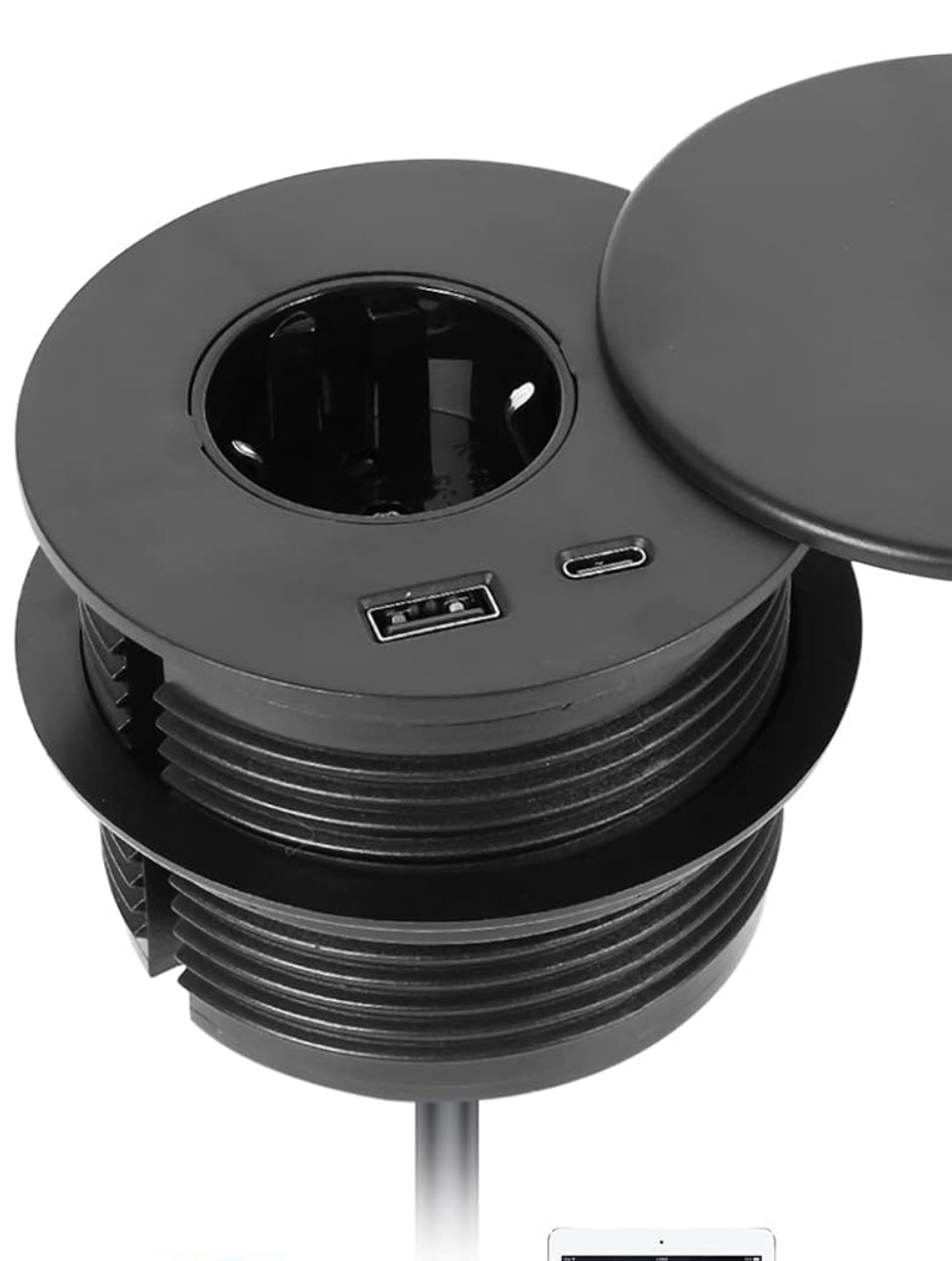 Строго говоря, можно просто ограничиться отверстием в столешнице под кабель 220В к розетке под ней. Но почему бы не попробовать это сделать красиво, раз уж всё равно сверлить.