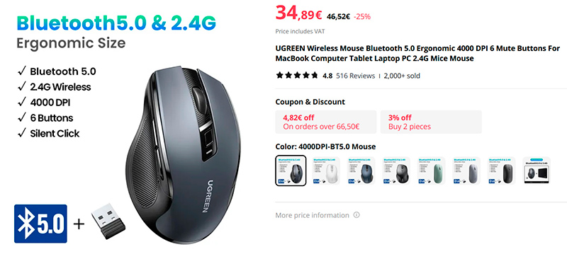В очередной раз заказал еще пару вот таких мышек Ugreen с подключением по Bluetooth (для ноутбуков особенно актуально, чтобы порт не занимать) и по радиоканалу (адаптер в комплект входит). Я просто свою отдал племяннику (ему срочно нужна была мышка с подключением по Bluetooth), ну и жене хотел поменять ее мышку для ноутбука (у нее с адаптером) на мышку с подключением по Bluetooth. А лучше чем эта из недорогих - на мой взгляд, не найти, сам ее использую с большим удовольствием.