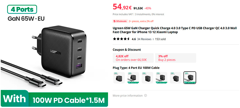 4-портовый компактный GaN адаптер для зарядки от Ugreen на 65 Вт мощности в комплекте с полуметровым кабелем на 100 Вт. Закрывает все потребности, я сам именно этот адаптер и использую, он отличный.