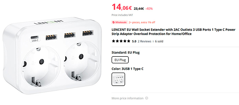 Удобный европейский тройник на две розетки и четыре порта USB: три USB-A и один порт USB-C.