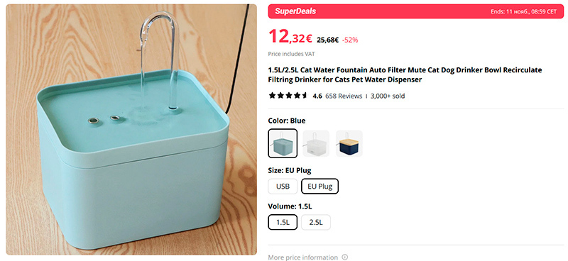 Простенькая поилка для котиков. Питается от сети или через USB, три варианта цветов, на 1,5 или 2,5 литра.