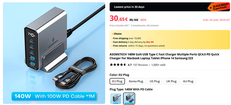 Мощный GaN адаптер аж на 140 Вт от неплохого производителя на пять портов (3xType-C, 2xType-A): поддержка Power Delivery  (подходит для различных ноутбуков) и QC 4.0. Есть вариант комплектации метровым кабелем, рассчитанным на 100 Вт.