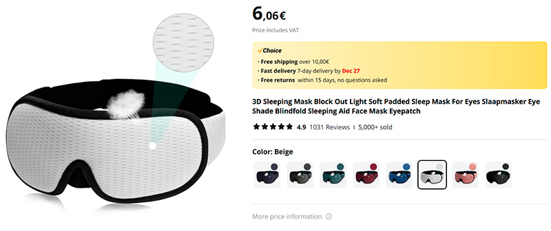 Удобные эргономичные маски для сна, защищающие от воздействия света. Я использую именно маску такого типа. Маски сделаны из плотного, но дышащего материала, имеют вырез для носа и углубления в районе глаз, регулируются по охвату. Восемь вариантов цветов.
