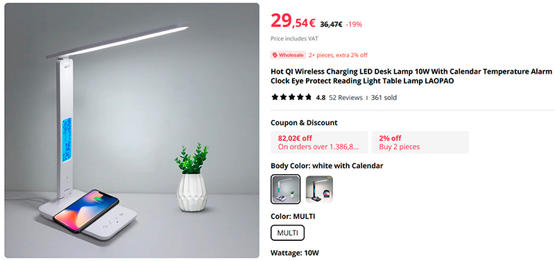 Навороченная настольная лампа с дисплеем и беспроводной зарядкой для смартфона. Несколько режимов яркости, регулировка цветовой температуры, гибко регулируется источник освещения - может располагаться под различными углами. На дисплее показываются часы, календарь, термометр и есть будильник. Беспроводная зарядка на 10 Вт совместима с любыми устройствами, поддерживающими стандарт Qi.