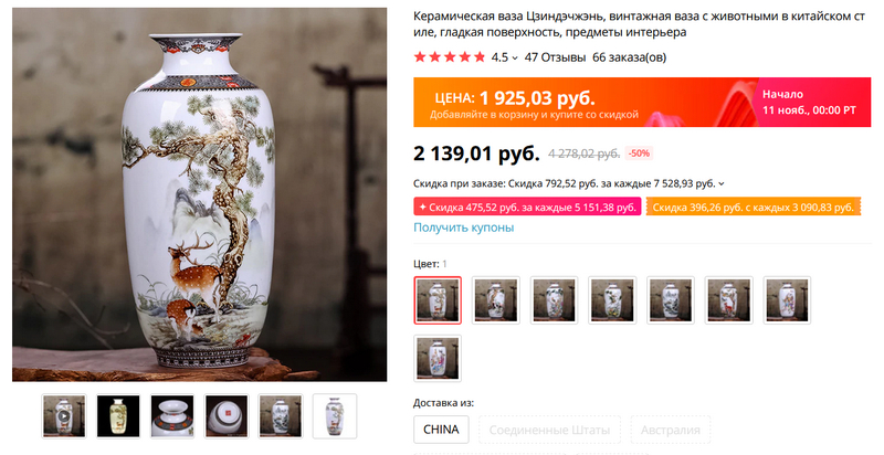 Вот на эту штуку я реально, что называется, запал - винтажная ваза с росписью в китайском стиле. Вряд ли это ваза династии Цинь, скорее это ваза династии Цзиньпин, но смотрится классно, там в отзывах полно реальных фотографий.