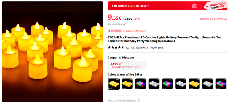 Дешевые наборы по 12/24/48 штук LED-свечек различных цветов. Батарейки входят в комплект. Светят ровным цветом без имитации пламени.