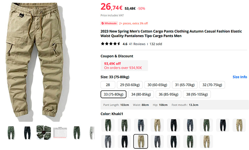 Большой выбор мужских хлопковых брюк-карго. Шестнадцать вариантов фасона и различных цветов. Размер проверяйте по соответствующей таблице. Мне такие нравятся, очень удобные, но в Amazone нужного фасона нашел только пару вариантов расцветки, здесь заметно больше. Ну и дешевле в два раза.