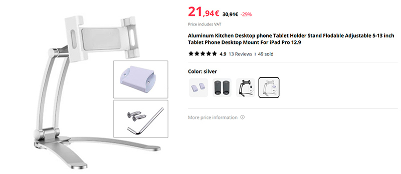 Искал себе продвинутую подставку-держатель для смартфона и планшета (имеющаяся - очень примитивная, неудобно), ну и вроде нашел то что нужно. Алюминиевая, складная, с достаточно высокой ножкой (мне это важно для видеочатов), гибко регулируется. Два цвета, отдельно можно докупить настенный держатель соответствующего цвета, крепящийся на двухсторонний скотч.