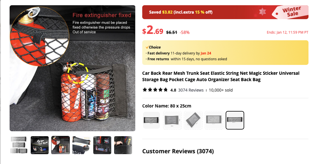 3. Сетка для багажника. Брать стоит только самую большую, 80х25. Очень удобный органайзер за 2 бакса.