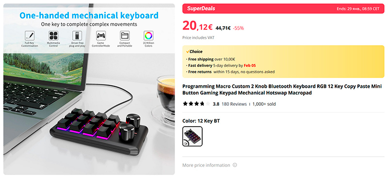 Ну а если хочется чего-то более продвинутого - программируемая 12-клавишная клавиатура с двумя вращающимися ручками. Там для каждой клавиши можно задавать достаточно сложные комбинации (и ввод до 18 символов) - например, для Photoshop, Lightroom и других программ. Программируется по проводному соединению, а работать с ПК может и по Bluetooth.