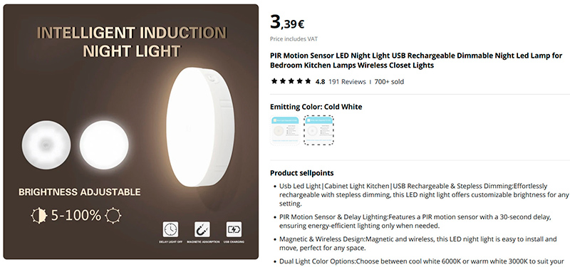 Простенький и дешевый светильник-ночничок с датчиком движения. Легко монтируется куда угодно с помощью липучки, расположенной на нижней крышке. Яркость регулируется, на выбор два варианта цветовой температуры: теплая и холодная.