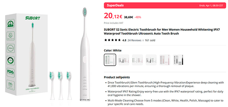 Совсем недорогая электрическая вибрационная зубная щетка SUBORT S2 Sonic с тремя запасными головками. Пять режимов работы, 41 тысяча вибраций в минуту, зарядка через USB, водонепроницаемость IPX7, до 90 дней время работы от одного заряда. Варианты цветов: белый, черный и розовый.