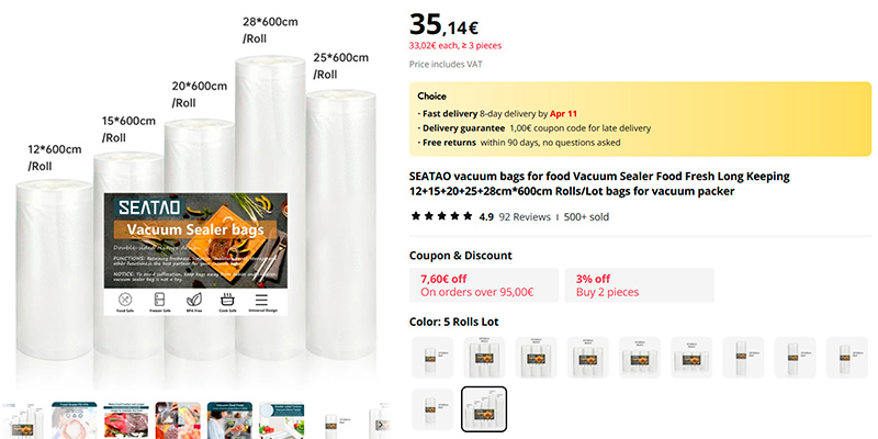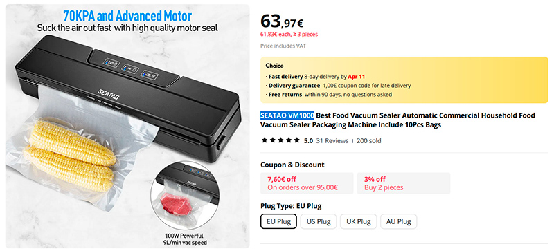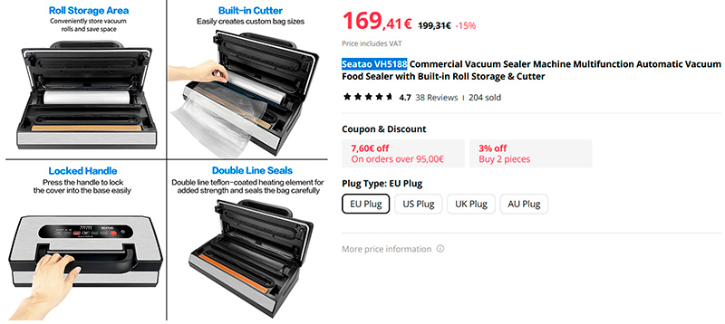 Есть у них и совсем крутые и продвинутые модели, но они уже дороговаты - например, Seatao VH5188 стоит аж €169, но в него уже можно загружать целый рулон (там встроенная внутри обрезалка), двойная линия запайки, более удобный замок (у дешевых моделей замки с двух сторон, здесь ручка с одной стороны) и прочие прелести. Наверное, закажу его, хочется сравнить с моим. А учитывая то, насколько часто мы его используем, эта стоимость быстро отобьется.