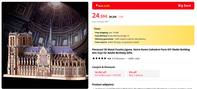 Для любителей конструкторов - металлический конструктор Собор Парижской Богоматери: 382 детали, 5 уровень сложности, размеры 15,1 х 10,7 х 6,1 см.