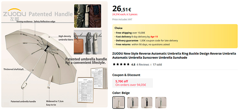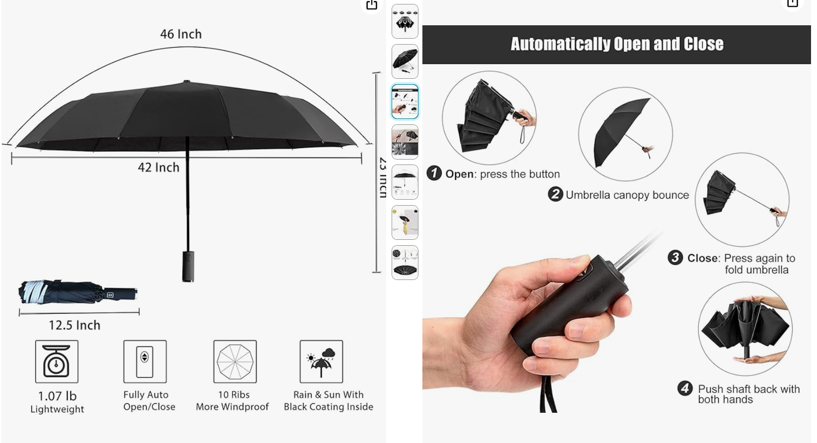 Если же требуется более компактный автоматический зонтик, то вот более компактный складной вариант с ручкой-карабином и светоотражающей полоской для темного времени суток.