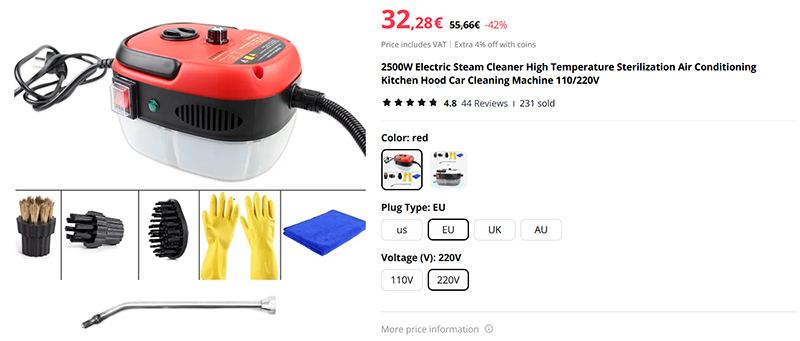 Домашний пароочиститель - штука в хозяйстве как минимум очень полезная, а как максимум - необходимая. Быстро и эффективно отмывать окна, плитку, алюминиевые и пластиковые шторки, всякие поверхности, покрытые жиром (газовая плита, гриль и так далее) - это все делается только хорошим пароочистителем! Я делал обзоры пароочистителей, в частности - модели Kitfort KT-933, которая у нас прослужила несколько лет, но на третий год все-таки вышла из строя. Эта модель сейчас стоит под €170 (16590 рублей).