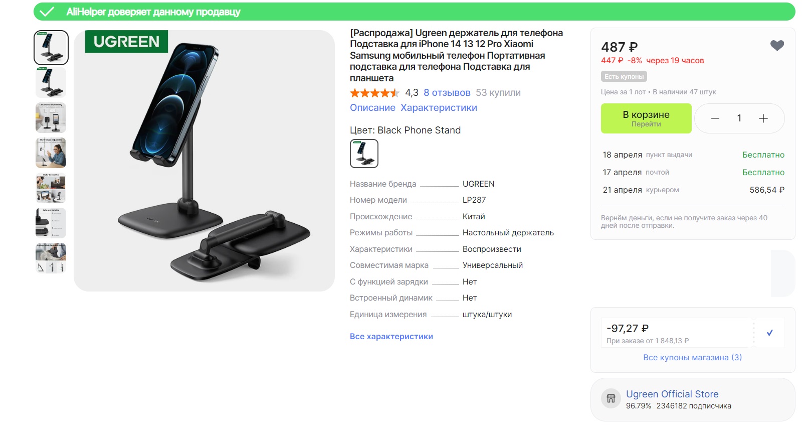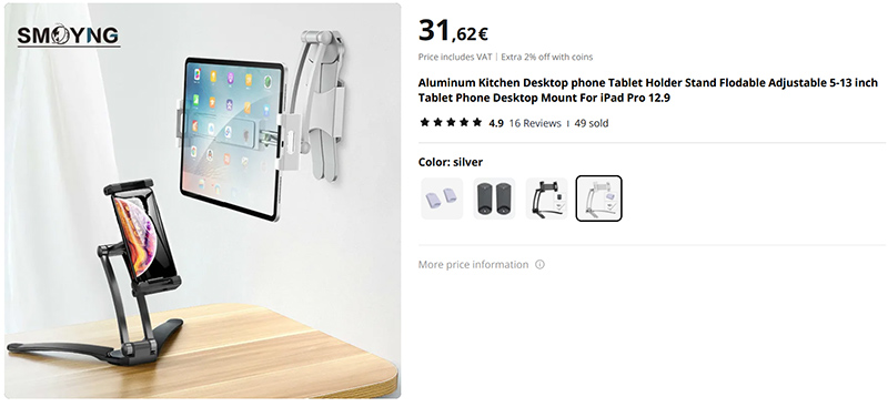 Очень удобная, гибко регулируемая алюминиевая подставка для смартфона и планшета, причем здоровенный iPad Pro 12,9" она тоже поддерживает. Может стоять на столе, также может крепиться к стене, для чего в комплекте идет специальный держатель, который может крепиться на клейкую ленту, а может и прикручиваться саморезами в дюбели - для надежности.