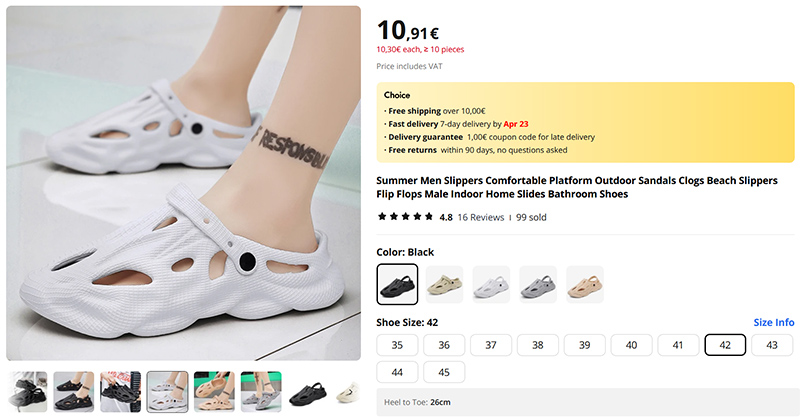 Кроксы - это уже прошлый век: есть намного более стильные варианты. Есть, конечно, крутые Adidas Yeezy Foam Runner по цене от €130 до €500, но друзья китайцы предлагают не слишком отличающийся вариант по цене в €11. У них еще и держатель есть, как у кроксов.