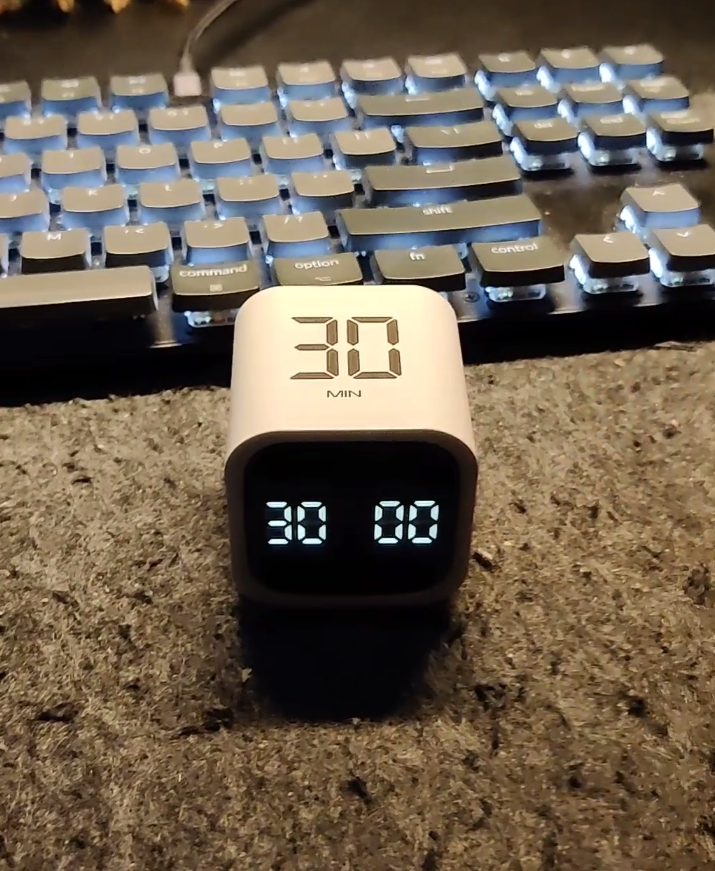 И прилагаю фото девайса на моем столе. Принцип работы прост: переворачиваешь - отсчет пошел. Повернешь экраном вверх - пауза. Если вниз - сброс. Есть ручная настройка. Тактильно - девайс приятный. Собран хорошо.