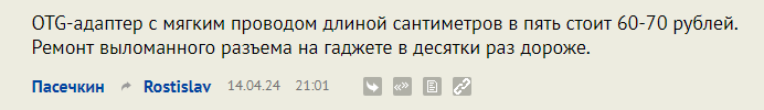 P.S. Да, есть и хабы и переходники со шнурком. Но носить их с собой не так удобно. Опять таки, если не соблюдать минимальные навыки аккуратности, можно разъём даже обычной зарядкой уничтожить. Никогда о таком не слышали? А вот мой тесть умеет!