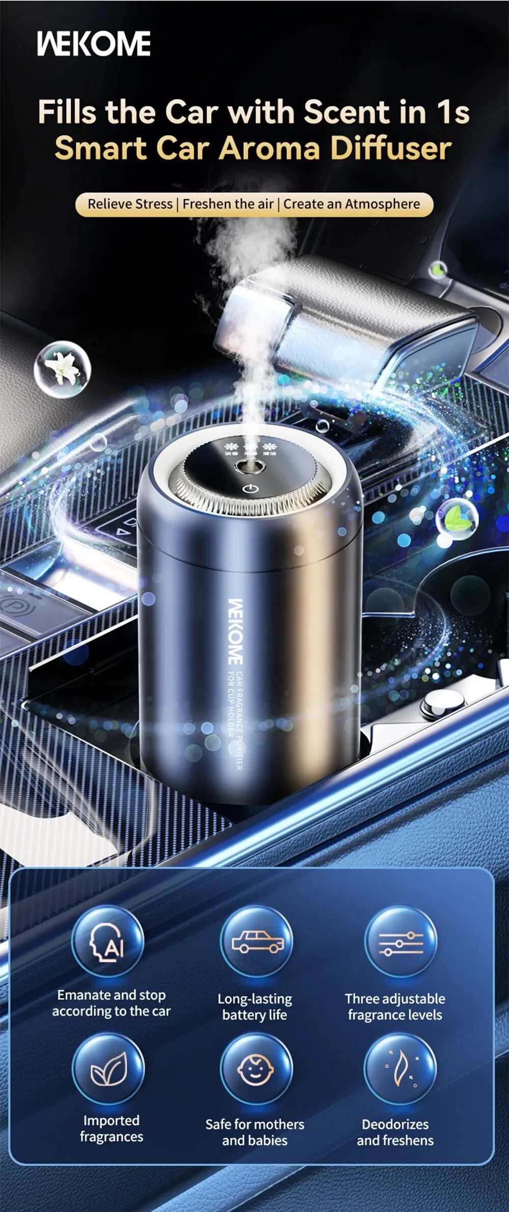 Работает, подстраиваясь под движение автомобиля. Есть 3 варианта интенсивности распыления. Есть подсветка. Заряжается от Тупе-С. Запах приятный, работает тихо.
