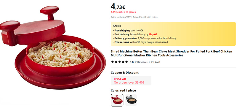 Простенький, но эффективный измельчитель различных продуктов для салатов, тако и так далее. Прежде всего, предназначен для измельчения мяса: курицы, говядины, свинины, рыбы. Также может измельчать овощи.