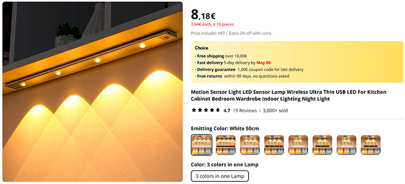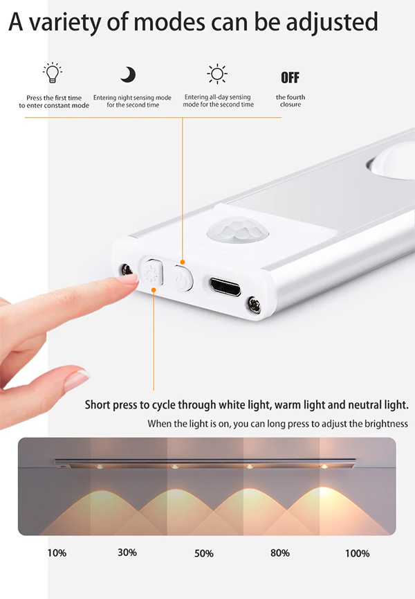 LED-подсветка, снабженная датчиком движения - для самых разнообразных применений: для кухни, для кабинета, для шкафов и так далее. Легко устанавливается: два магнита, которые крепятся на липучке, к ним примагничивается панель со светильниками, которую можно снять, чтобы зарядить через USB. Три вида цветовой температуры, разные настройки.