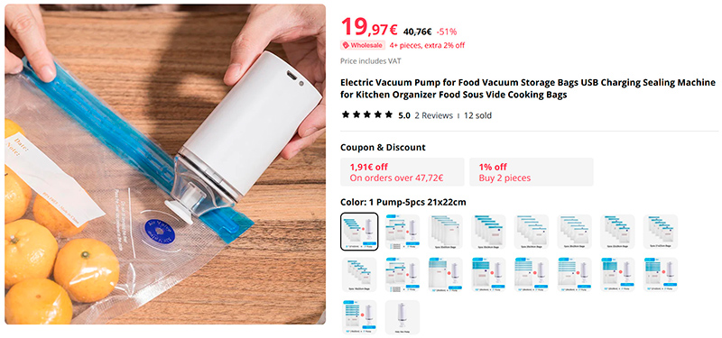 Я неоднократно писал про вакууматоры (сам я пользуюсь вот таким, и вот его обзор): на мой взгляд, это устройство просто из серии must have. Однако это устройство не сказать что очень маленькое, к нему надо приобретать одноразовые пакеты в рулонах, и иногда, когда нужно быстро что-то запаять в пакет, хочется это сделать как-то побыстрее. И мне тут попался вот такой вариант вакууматора: простенький, дешевый, работающий с многоразовыми пакетами с клапаном. Там есть разные варианты комплектации с пакетами разных размеров. Заряжается вакуумутор через порт USB. Заказал себе, попробую его в работе.
